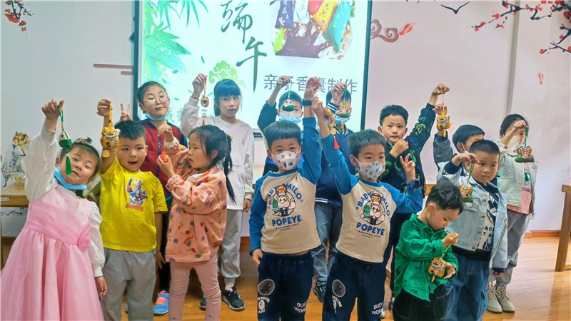 悠悠香囊味,濃濃端午情。誰說針線是女生的專利,男孩子照樣幫媽媽穿針引線,不一會兒,花色不同、圖案精美的香囊雛形就完成了,親子們把中藥包放入縫制好的香囊中,串上玲瓏剔透的珠子,掛上色彩繽紛的流蘇,一個個飽滿芳香的中藥香囊就制作完成了。端午節習俗,傳遞的是文化,傳遞的是感情。一個簡單的香囊不僅增加傳統節日的氛圍,更有利于親子增進情感,同時培養了孩子們的動手能力和創造力,還進一步了解了中華傳統文化。在小朋友心中埋下了愛國主義的種子,厚植愛國主義情懷,引導他們成長為新時代“四有青年”。